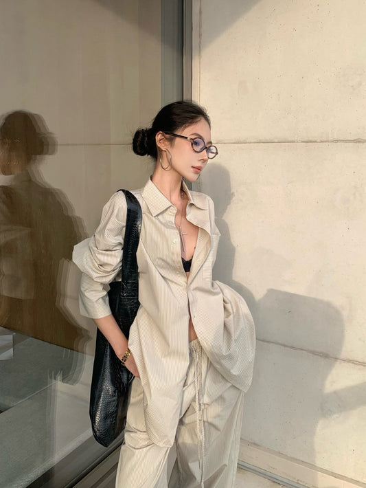 25Aug. 窒息慵懶高級感寬鬆條紋襯衫 抽繩休閒褲