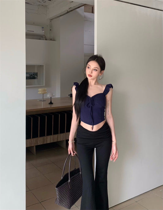 Jun. 日系純欲抽繩顯瘦上衣 藍/紅 黑色高腰休閒褲