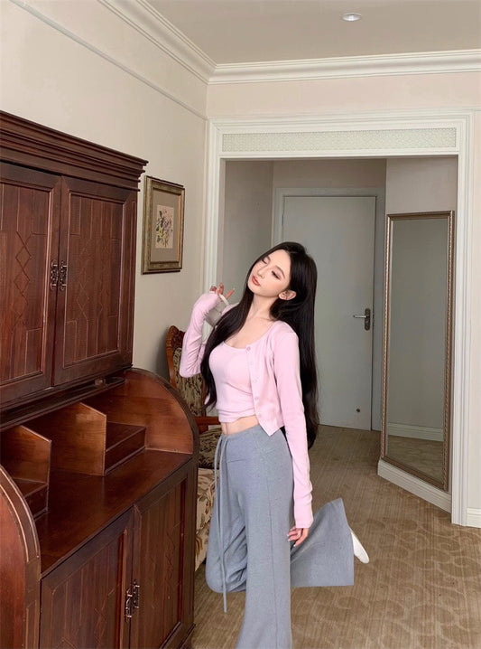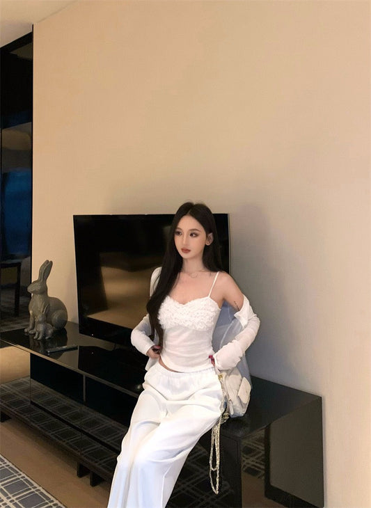 25Nov. 法式純欲感褶皺背心開衫2件組 休閒闊腿褲 米白色系