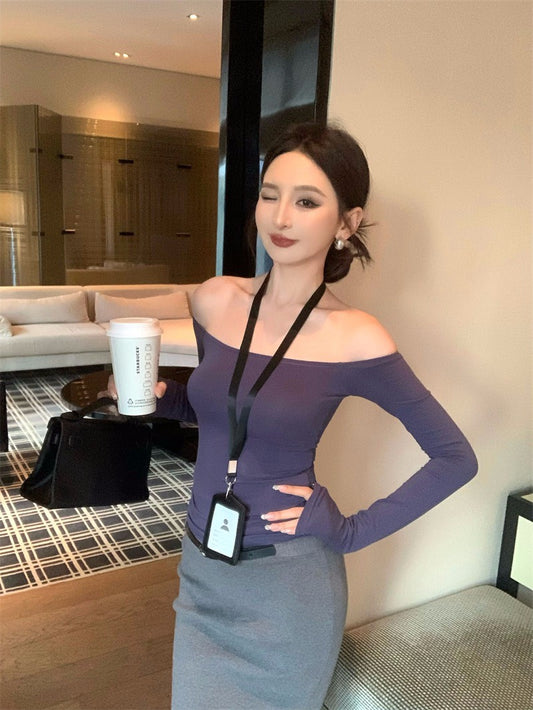 25Nov. 魅惑肩線一字領彈力長袖上衣 寶藍/卡其