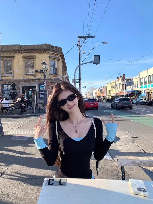 25Nov. 辣妹宣言休閒撞色V領針織上衣 黑拼藍/咖拼卡