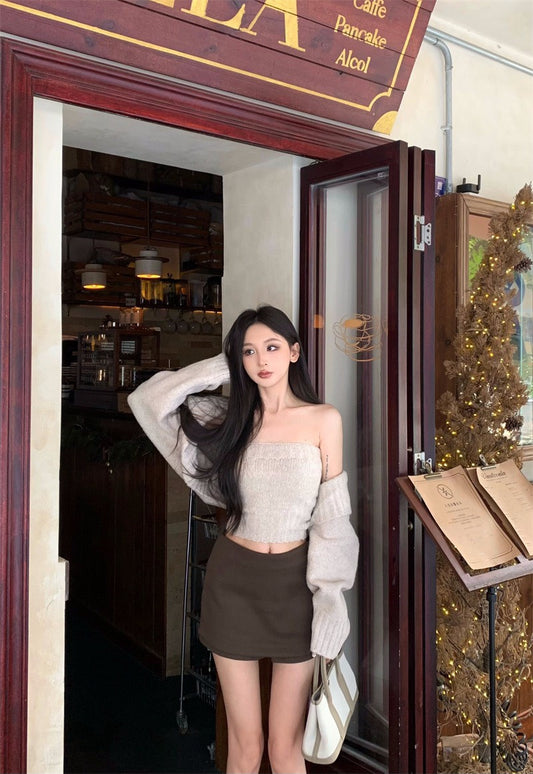 25Nov. 溫柔厚磅軟糯糯抹胸開衫2件組 咖色半身褲裙