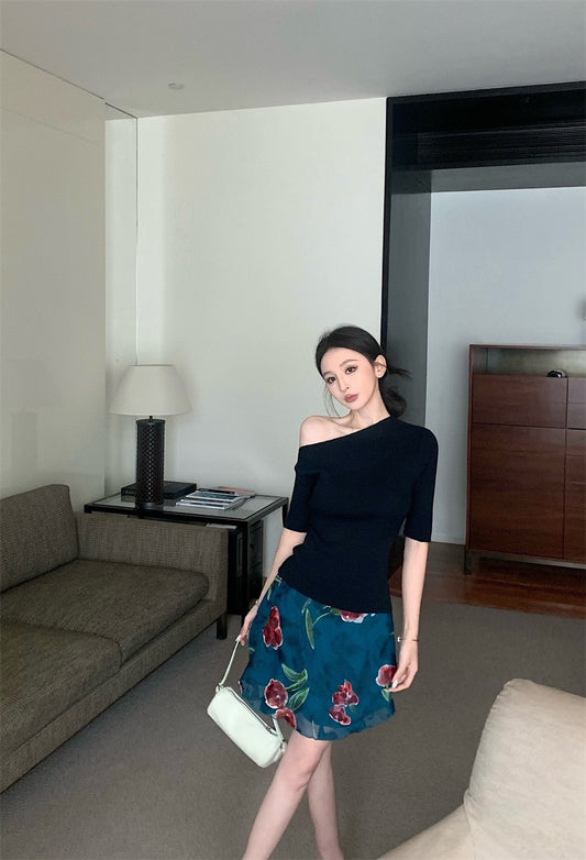 Jun. 半熟女伶 斜領修身針織上衣 藏藍 復古花網紗半身裙 藍