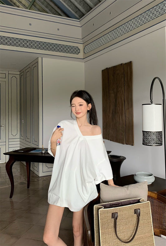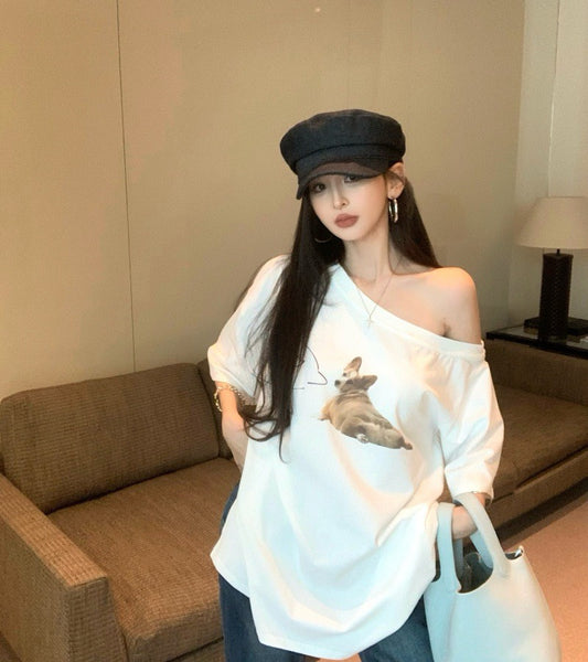 Jun. 哈嚕柯基修勾慵懶斜肩寬鬆上衣 白