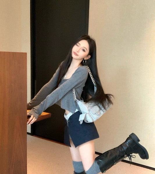 Jun. 可拆式設計款2件套褲裙 簡約U領寬鬆上衣 灰