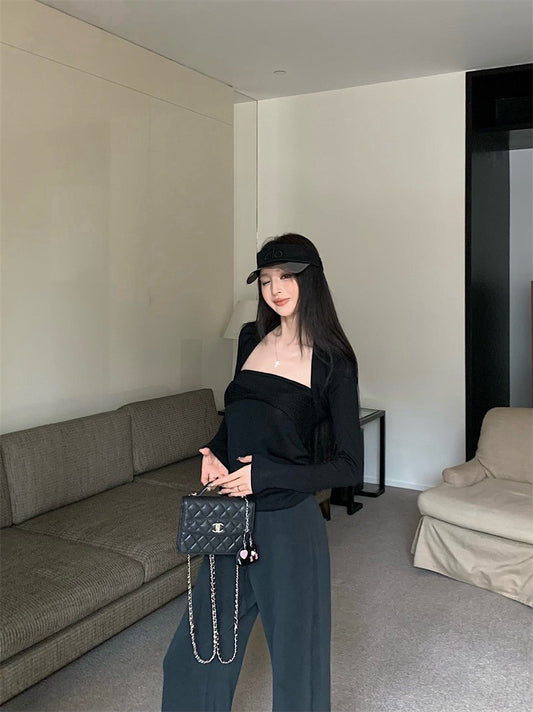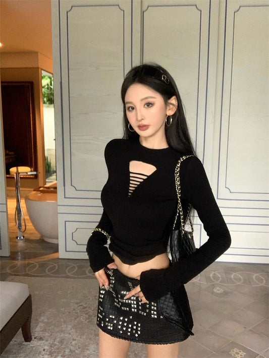 Jun. 辣妹特務 低V縷空設計長袖上衣 黑