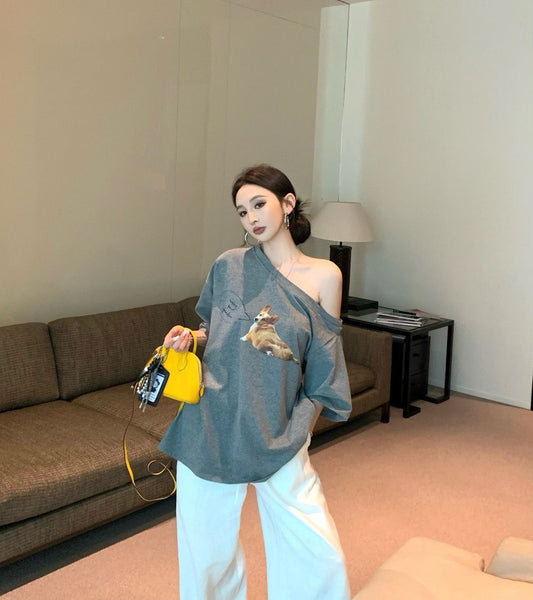 Jun. 哈嚕柯基修勾慵懶斜肩寬鬆上衣 灰