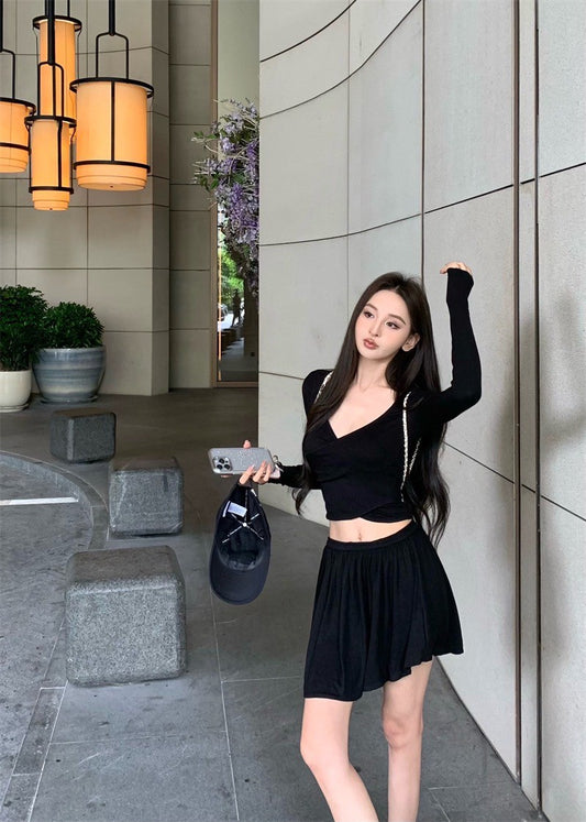 25Jul. 穿出鬆弛感 短款V領上衣 垂垂半身短裙 黑