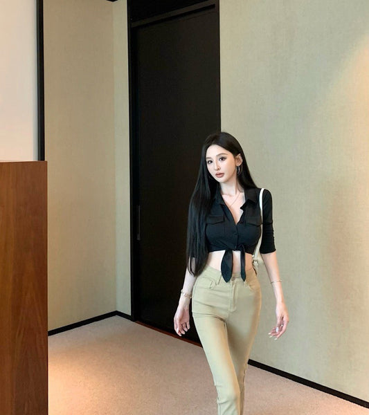 Jun. 辣復古 綁帶短款襯衫 黑 高腰卡其修身喇叭褲