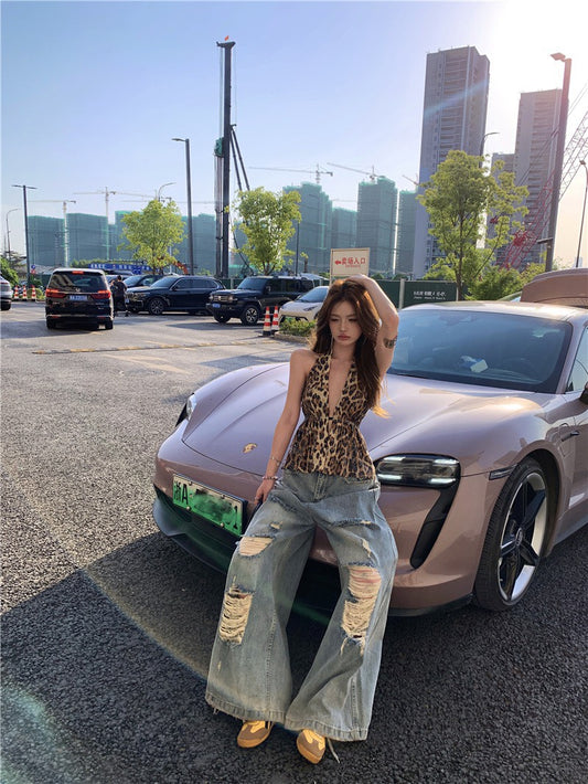 Jun. 曼谷city辣妹花紋亮片露背上衣 不規則刷破闊腿牛仔褲