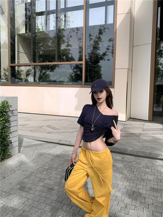 Jun. 休閒plus藏青色V領顯瘦上衣 黃色空氣薄棉休閒褲
