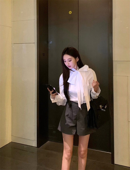 May. 復古法式大蝴蝶結綁帶+襯衫 高腰西裝短褲