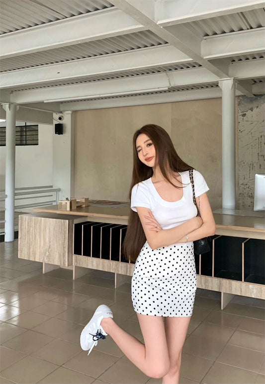 Jun. 復古Dress code簡約顯瘦短袖上衣 波點A字裙 2色