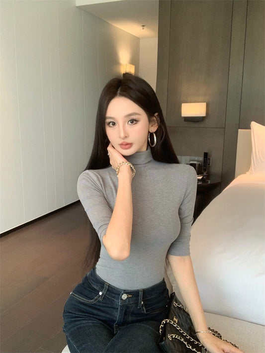 Jun. 穿不膩簡約高領五分袖彈力上衣 灰/卡 顯瘦喇叭褲