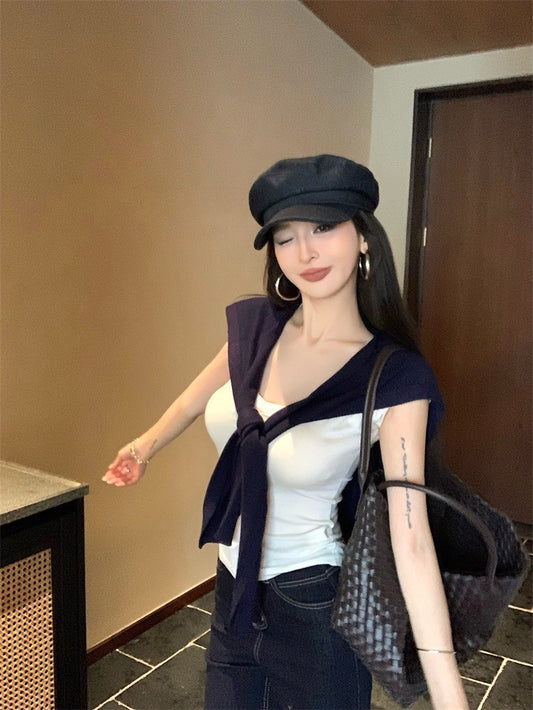 Jun. 美式慵懶遛彎三件 灰色開衫 白/黑背心 黑色休閒褲