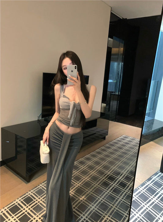 May. 性感毛邊透紗拼接背心 低腰彈力半身裙 灰
