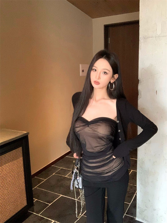 Jun. Kiss初吻性感網紗抹胸 鈕扣開衫 黑