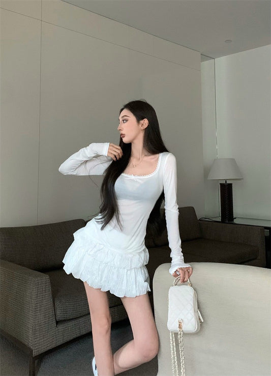 Jun. 奶椰泡泡 薄款芭蕾風打底上衣 花苞半身裙 白