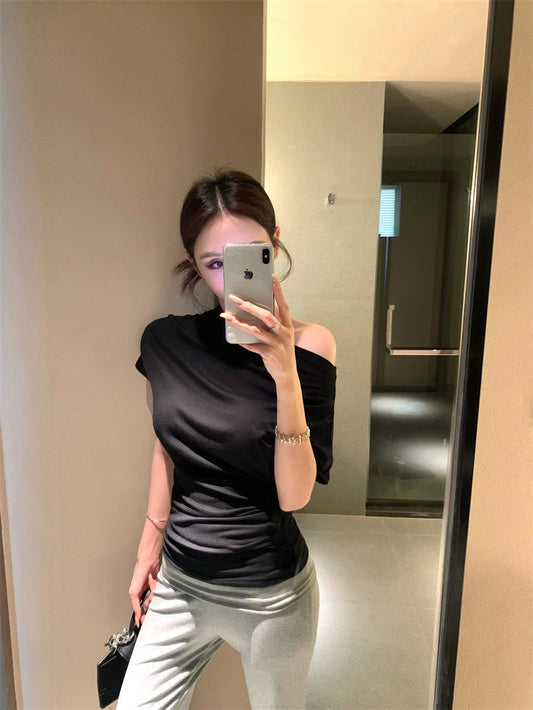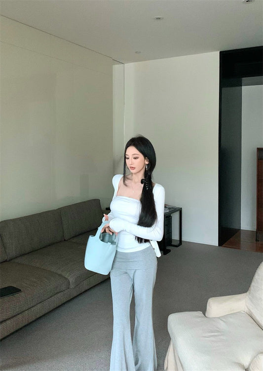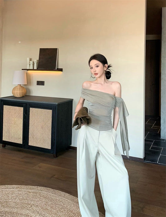 Jun. 姐系高智 單肩飄帶彈力上衣 時髦簡約休閒褲 杏
