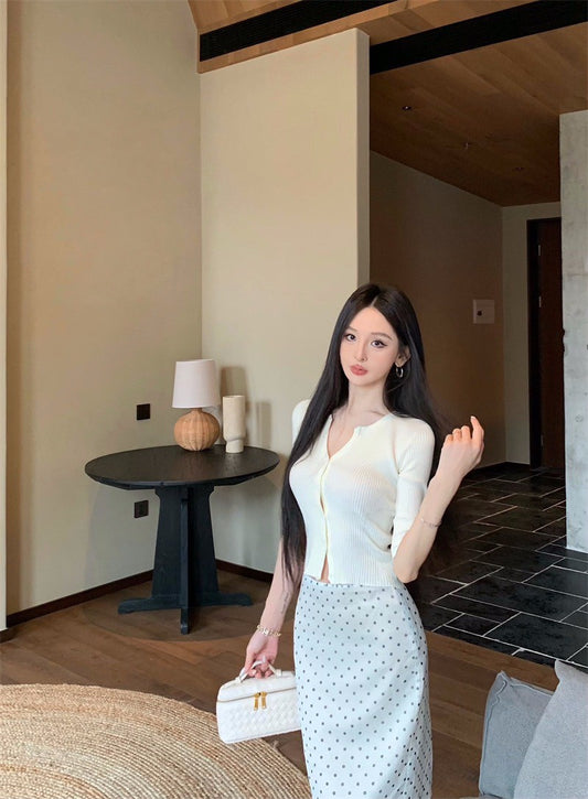 Jun. 鄰家乖乖女 顯瘦鈕扣針織上衣 米白/灰 復古波點中長半身裙 白