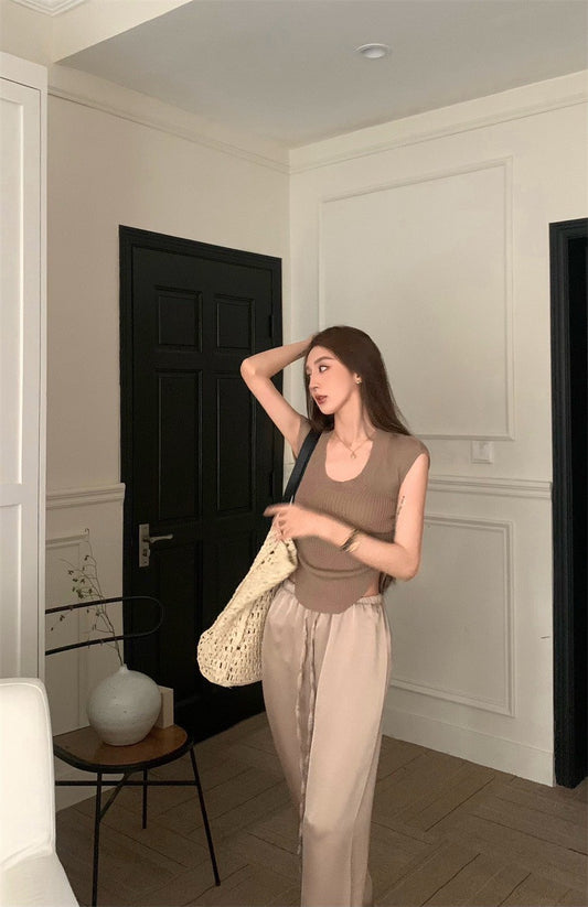 May. 居家舒適穿 U領針織修身上衣 緞面高腰休閒褲 卡其