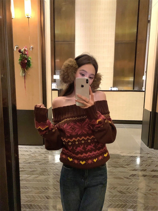 Jan. 復古粗針 棕色費爾島一字領顯瘦上衣 直筒修身牛仔褲