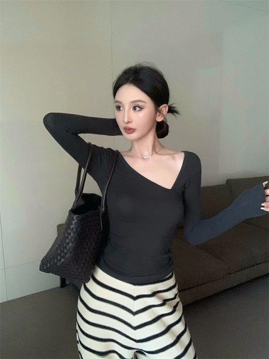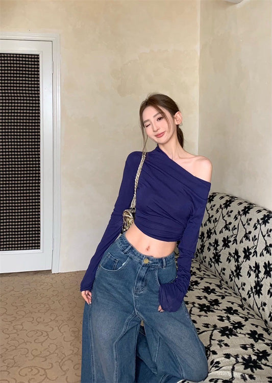 Mar. 休閒高智系 斜肩彈力修身短款長袖上衣 藍紫/杏色
