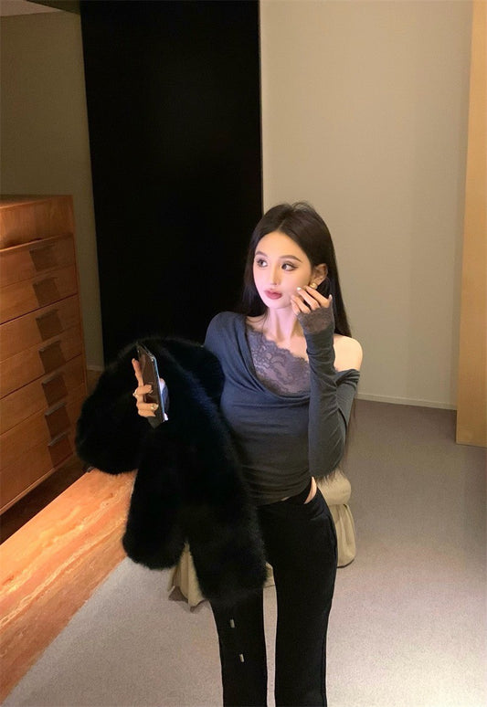 Apr. 輕透舒芙蕾 簡約純色蕾絲拼接領長袖上衣 黑/灰
