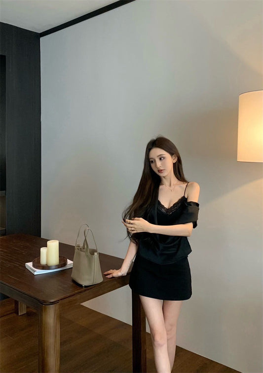 Jan. 氣質柔美 蕩感疊穿緞面上衣 粉/黑 修身黑色褲裙