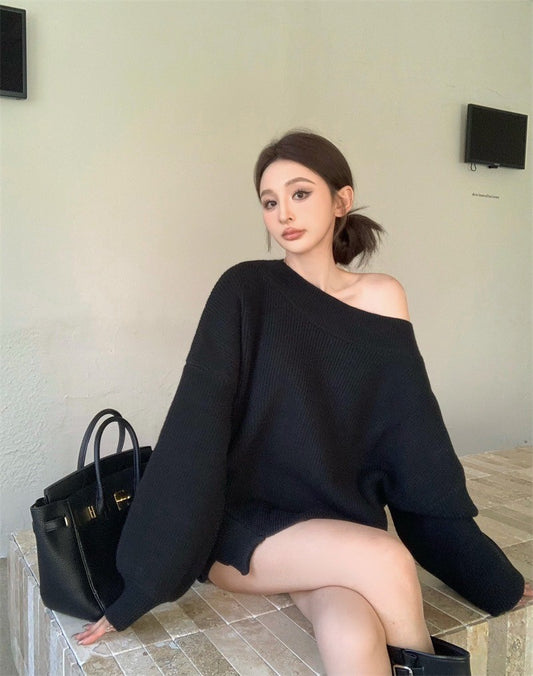 Mar. 奶欲甜心 氣質收腰蝙蝠袖斜肩針織上衣 顯瘦背心 卡杏