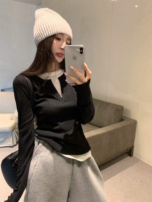 Feb. 中性美 慵懶休閒假兩件式拼色圓領上衣 黑/卡