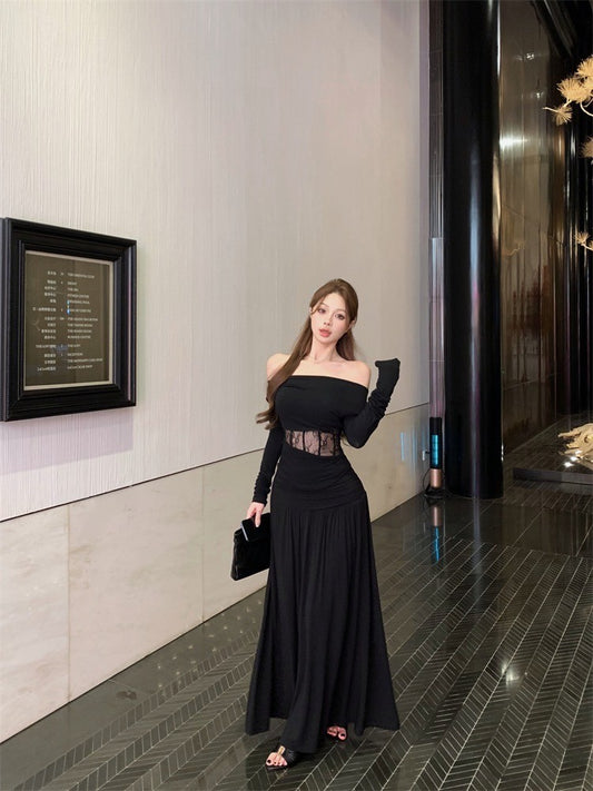 Mar. 香軟Crush 設計感一字領魚骨縷空上衣 褶皺飄逸半身裙 黑