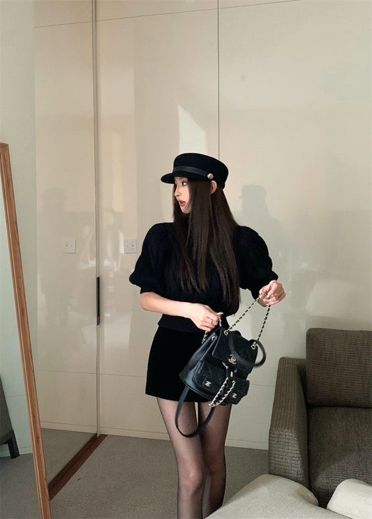 Feb. 俄羅斯娃娃 泡泡袖高領五分袖針織上衣 黑色A字裙