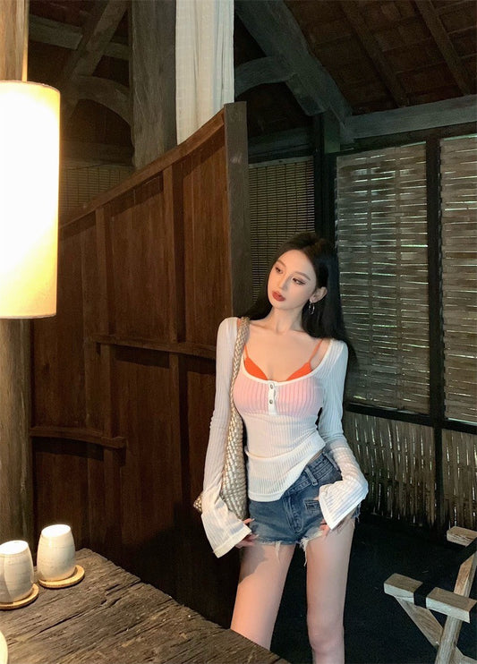 Apr. 疊搭純欲性感 透視感U領上衣 螢光色系吊帶