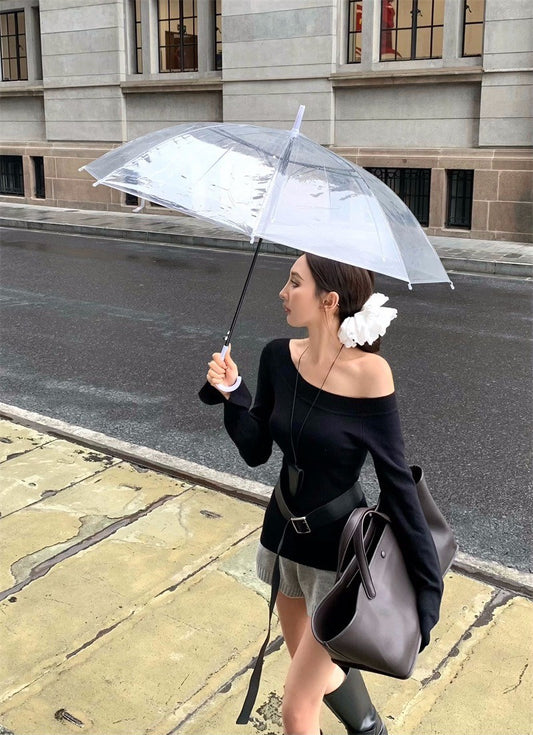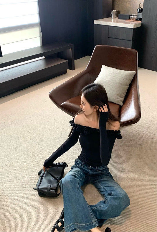 May. 花瓣少女 顯瘦一字領花邊修身上衣 黑色