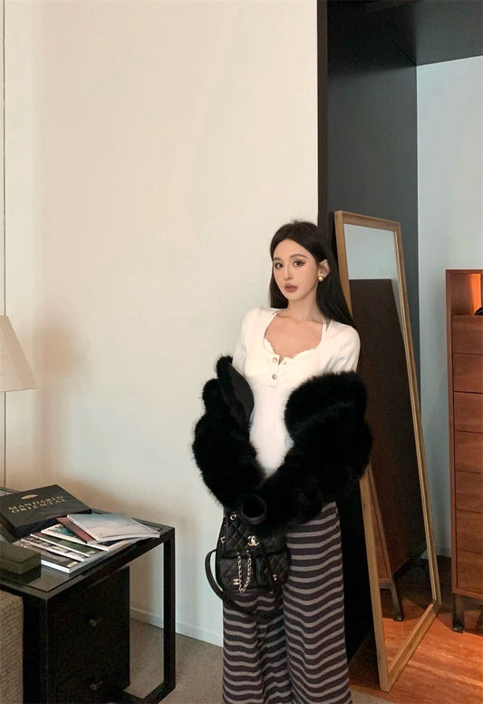 Jan. 氣質貌美 溫柔正肩修身針織上衣 魚尾半身裙 同色系仿貂馬甲 燕麥色