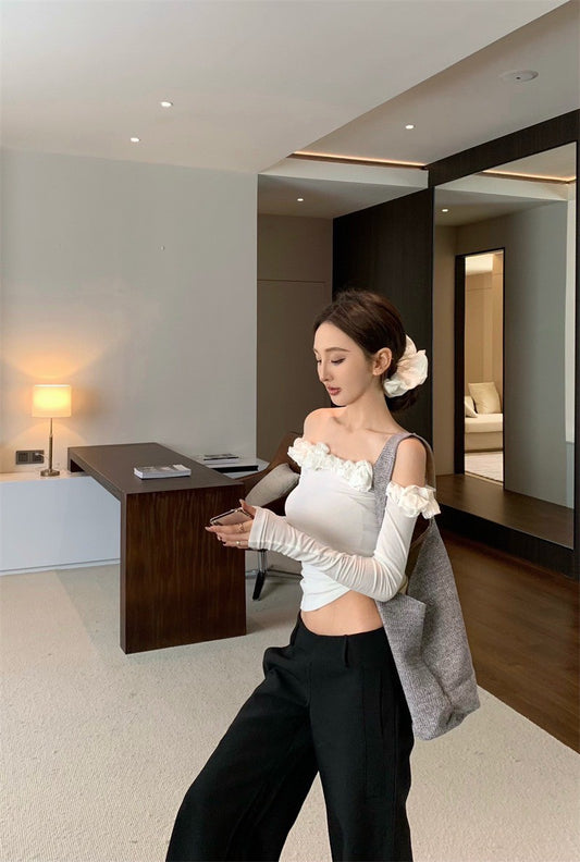 Apr. 法式褶皺單肩RO風辣妹上衣 米白