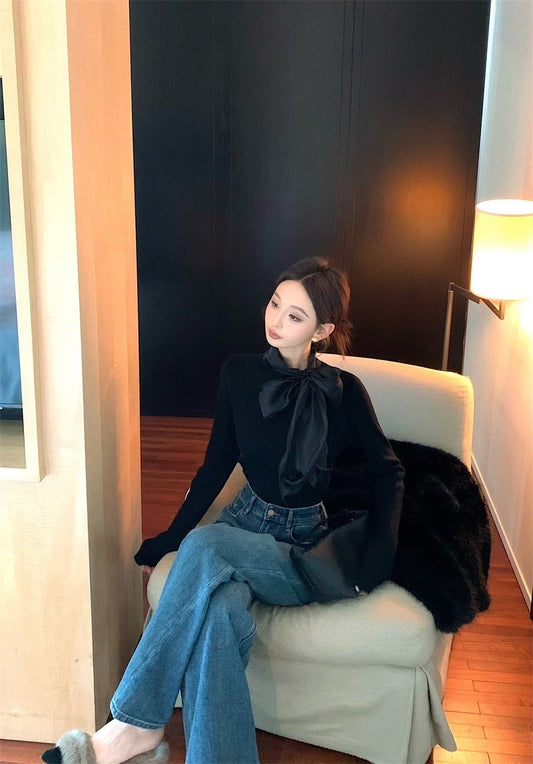 Feb. 內搭高手 綁帶蝴蝶領純色長袖上衣 黑