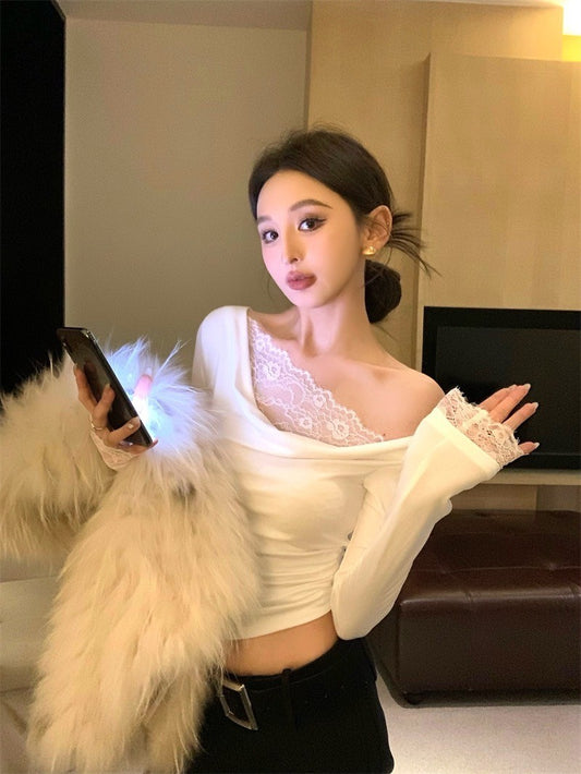 Apr. 輕透舒芙蕾 簡約純色蕾絲拼接領長袖上衣 米白
