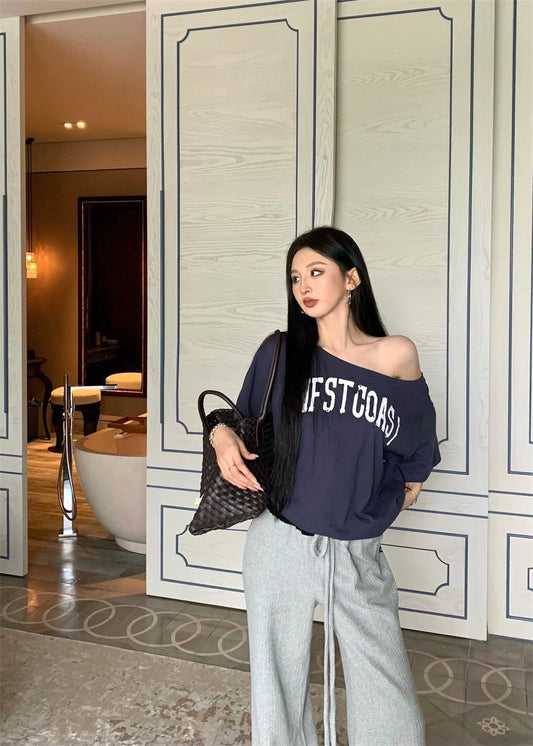 Apr. 慵懶美式一字領字母上衣 藏藍