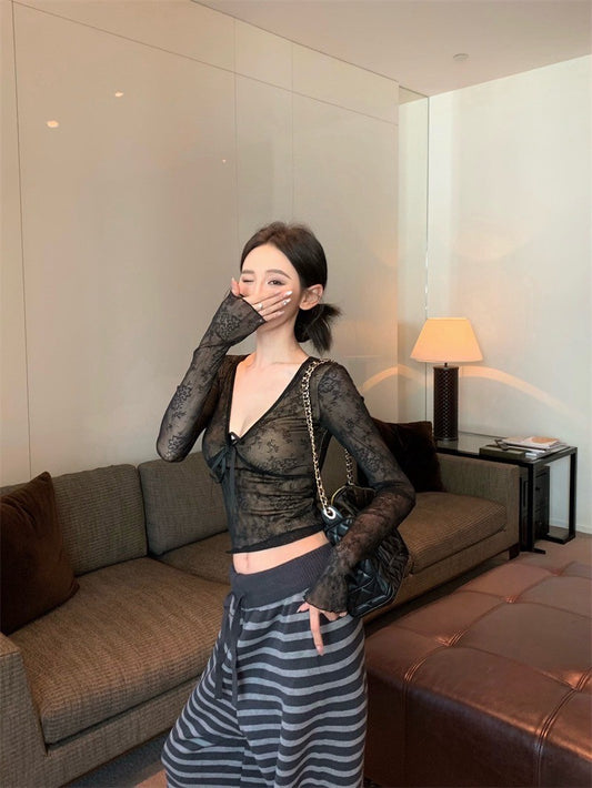 Feb. 氣質御用 性感純欲蕾絲V領修身上衣 黑