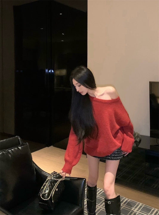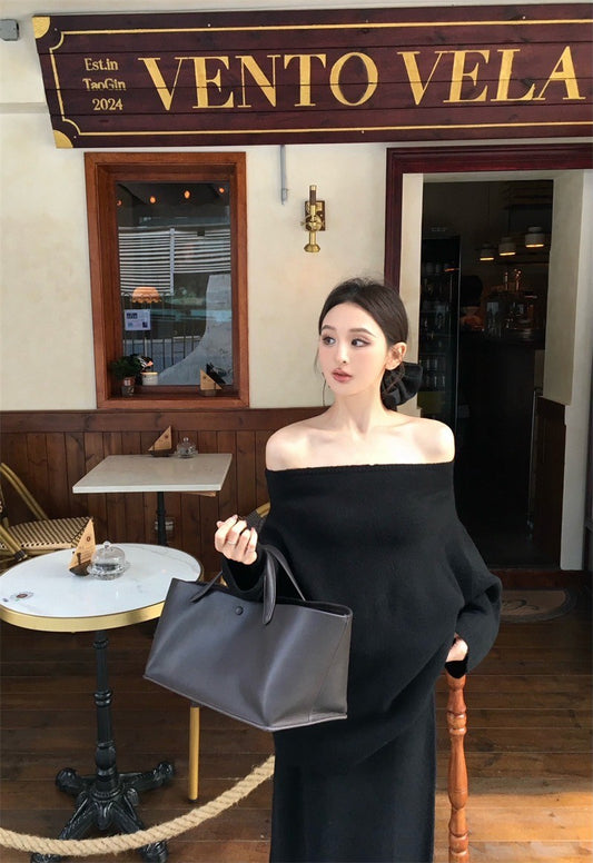 Dec. 溫柔開掛高級感針織 休閒一字領上衣 純色半身裙 黑