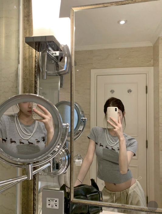 May. Jennie同款臘腸狗 美式正肩彈力上衣 灰