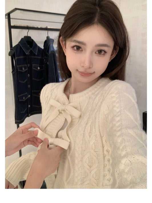 Jan. 氣質奶呼 coco奶白色蝴蝶結麻花針織上衣