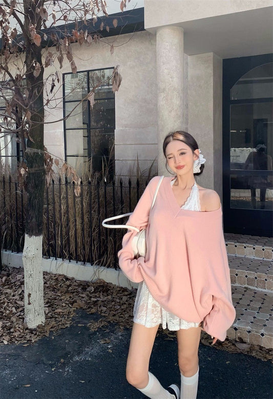 Oct. 暖心coco 高磅羊毛V領百搭粉色/灰色上衣 蕾絲連身裙