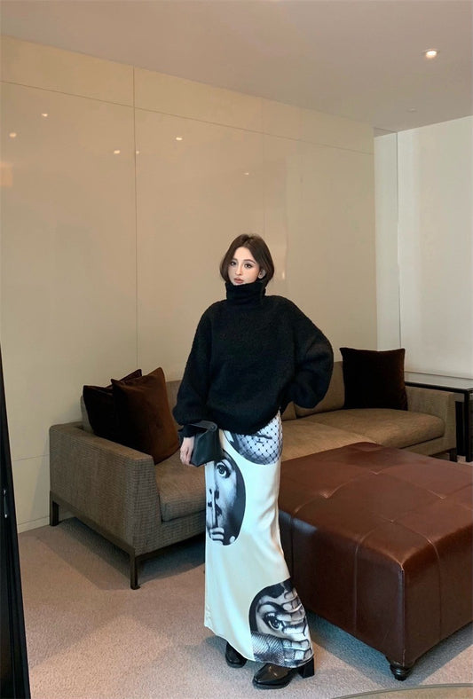 Jan. 不敗時髦 慵懶高領黑色毛衣 美式印花半身裙