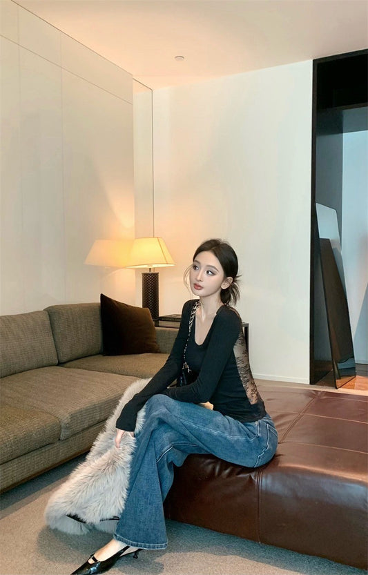 Jan. 辣妹性感露背蕾絲U領上衣 黑