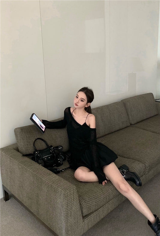 Aug. 復古辣妹 針織寬鬆慵懶上衣 黑色 高腰半身褲裙