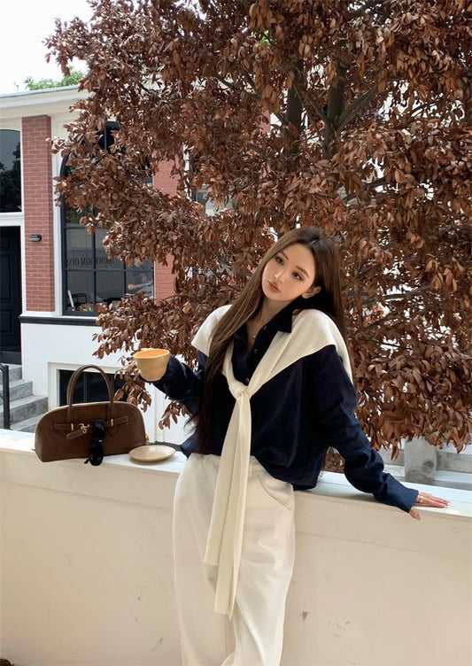 Oct. 慵懶老錢 簡約藏藍襯衫 休閒褲 米杏色披肩