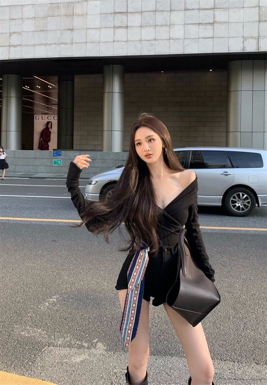 Nov. 復古港風V領抓皺針織螺紋上衣 黑色 高腰短褲
